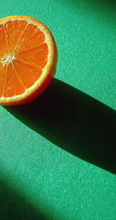 Detailed close-up view of a citrus fruit slice. The slice is a vibrant orange color and sits on a textured, vibrant green surface. The lighting creates a distinct shadow from the slice onto the surface. The image shows the detailed segments of the orange.