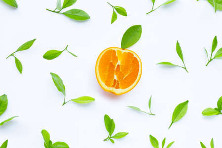 High vitamin C, Juicy and sweet. Fresh orange fruit with green leaves on white background.