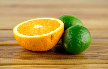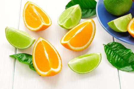 Citrus fruits with green leaves. Orange, lime segments on white wooden surface