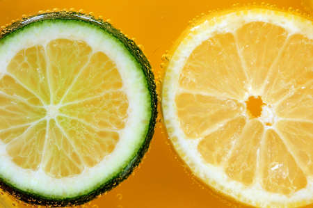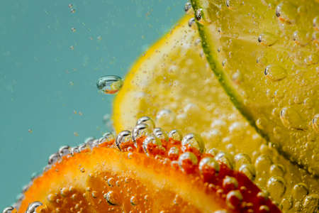 Bright, juicy orange tangerines, yellow lemons, lime green in water with air bubbles behind glass on a gray background