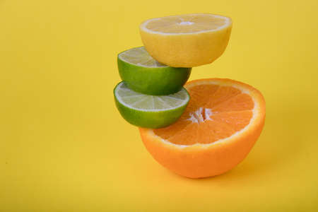 Fresh sliced orange lemon and limes uniquely stacked on a bright yellow background