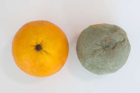 Orange fruits - one fresh and one decomposing and moldy. Top down shot from above on white background.