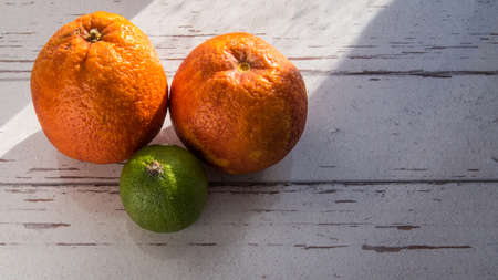 Two red oranges and a lime, close-up, copy space, pattern, rough shadows