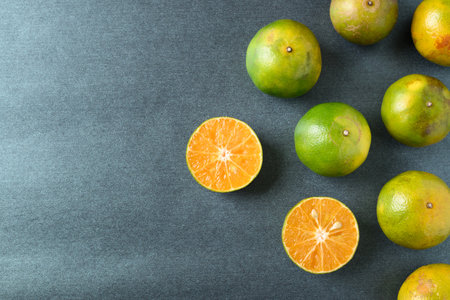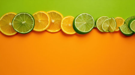 Banner with lime and orange. Copy space, top view, summer background. Generative AI.