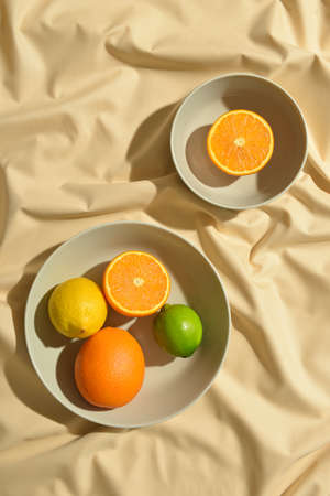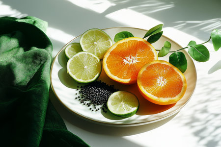 A visually appealing arrangement of fresh citrus fruits, including lemon, lime, and orange slices, displayed against a bright and cheerful background, ideal for food photography.