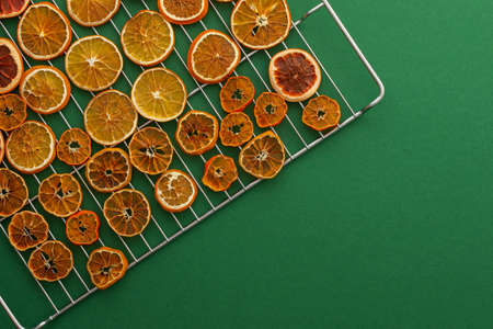 Oven dried sliced slices of orange, tangerine and grapefruit, dried citrus fruits on a wire rack, top view of fruits for Christmas garland