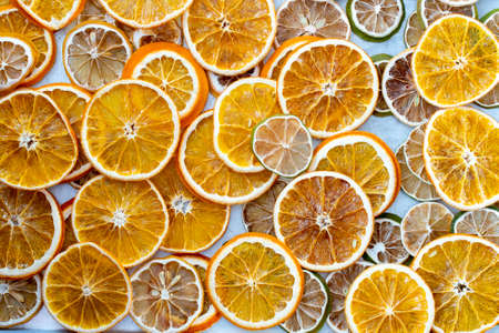 dried citrus fruits, dried oranges close-up view, macro photo, space for text, blank for design, background image of dried oranges