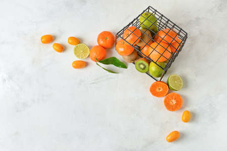 Citrus fruits and kiwi cut into circles, grapes on a white background with space for text. Poster, banner.