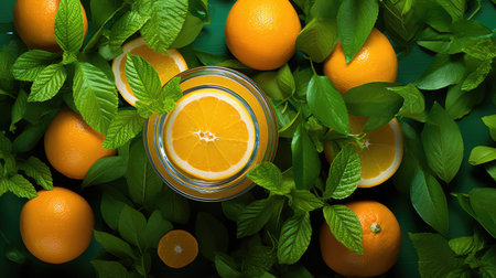 A vivid flat lay capture of fresh oranges and limes surrounded by lush green leaves, creating a vibrant and appealing composition perfect for food-related themes.