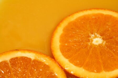 Whole and sliced oranges on an orange background. A popular tropical fruit.