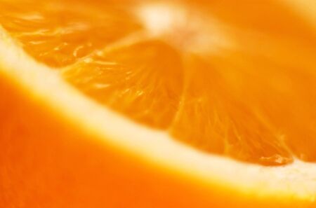 Flat lay of an orange slice centered on an orange surface with room for graphics and text (copy space)