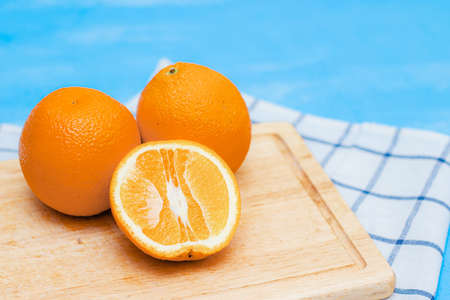 Whole oranges on a kitchen towel. Fruits are orange. The concept of advertising of orange juice. Banner with space for text. Good nutrition. Diet