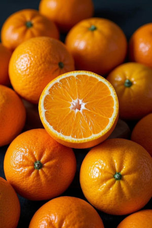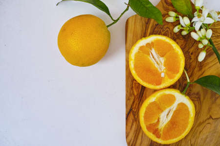 Close up of fresh oranges and cut oranges