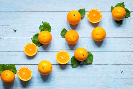 Fresh orange with leaves on wooden background. Top view, copy space