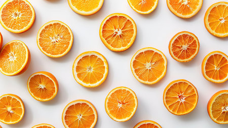 Close-up of orange slices laid out in a pattern on a clean white table, forming a bright and refreshing background