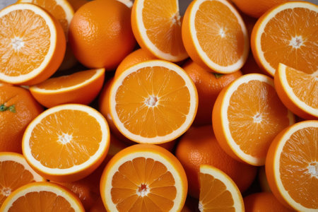 A bunch of halved oranges neatly arranged in a pile, showing the vibrant orange flesh and juicy segments.