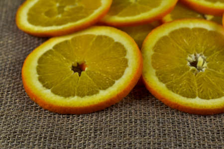 Slices of orange on a burlap background close-up