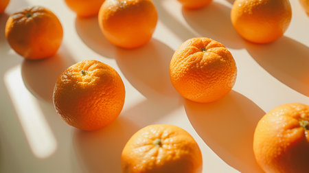 Fresh oranges bask in sunlight, casting long shadows, highlighting their vibrant texture and refreshing essence