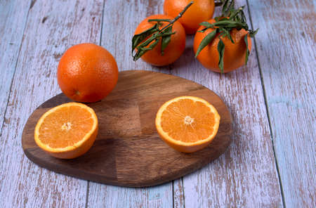 Whole and halved oranges on wooden board on wooden floor