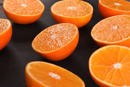 orange fresh cut on black stone. focus on orange fresh cut. with copy space for your text