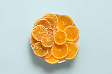 Sliced fresh and sliced fruits orange chips on blue background, home drying. Snack vegan free sugar food. View from above.
