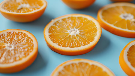 Bright orange slices on a vibrant blue background create a cheerful and fresh image. Perfect for food-related projects, recipes, and healthy eating.