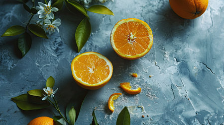 Sliced oranges with leaves and flowers on grey textured background