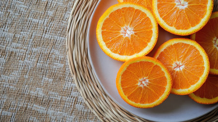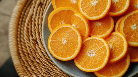 Fresh orange fruit sliced and arranged on a minimalist plate, rattan table adding texture, ideal for food styling with copy space