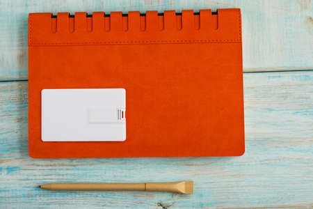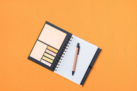 School notebook on a paper orange background, spiral notepad and craft cardboard pen