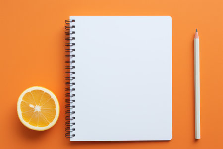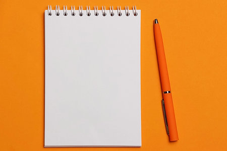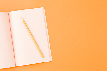 This image features an open blank notebook resting on a vibrant orange background, offering a fresh canvas for creativity and idea generation. Perfect for educational, artistic, and business themes.