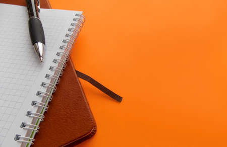Brown notebook, white spring notebook and black pen on bright orange background with copy space