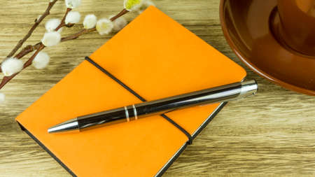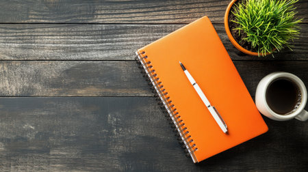 Create a productive atmosphere with this visually pleasing arrangement featuring an orange notebook, pen, coffee cup, and a green plant on a wooden surface.