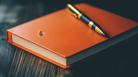 A close-up of a sleek gold pen resting on a bright orange notebook creates a vibrant and inviting atmosphere perfect for creativity and organization.
