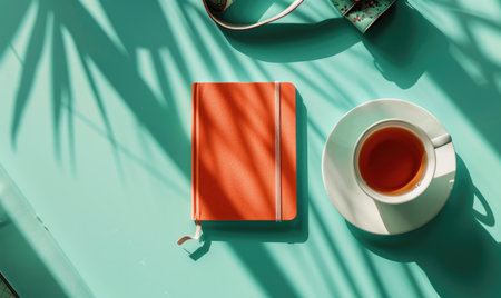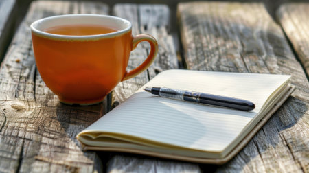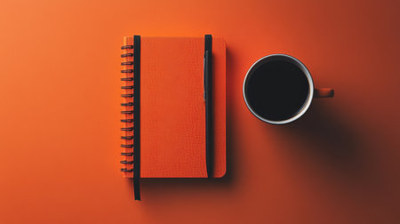 A vibrant orange notebook with a pen lies next to a dark coffee mug, creating an inviting workspace atmosphere. Ideal for creative projects and productivity.