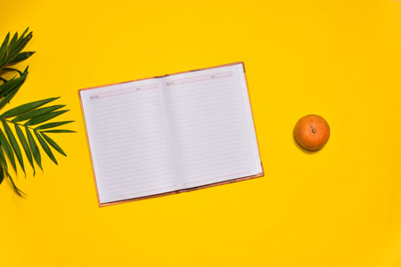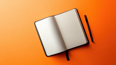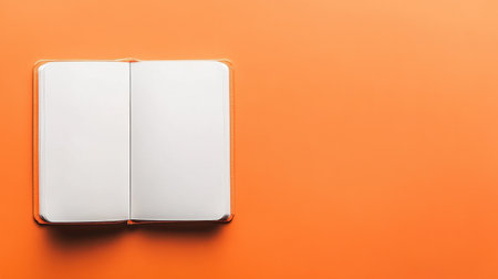 An open blank notebook rests on a vibrant orange background, inviting creativity and ideas on its empty pages, perfect for note-taking and journaling.