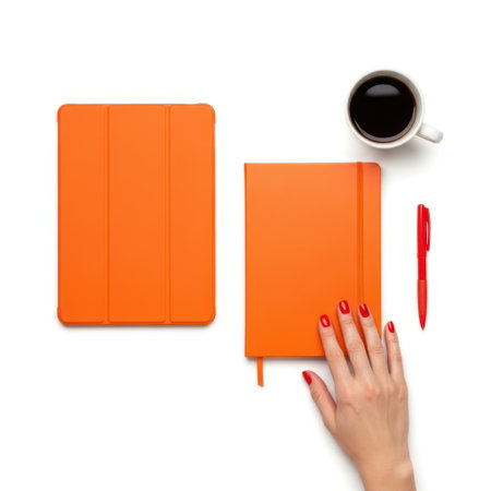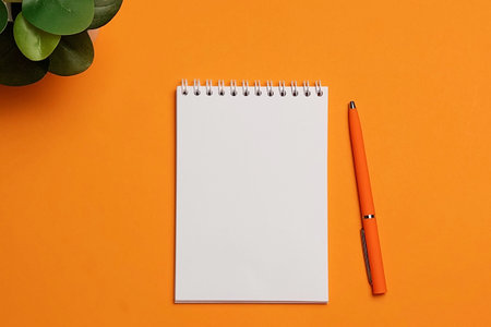 A vibrant orange notebook lies open with a sleek silver pen resting on it. This composition creates an ideal workspace for inspiration and creativity.