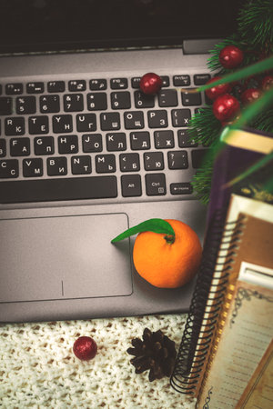 Workplace in winter, background of laptop with food citrus tangerines and books, notepads on knitted woolen sweater. High quality photo