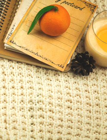 Winter background with knitted sweaters, books and tangerines, home comfort concept on cozy holidays, copy space photo