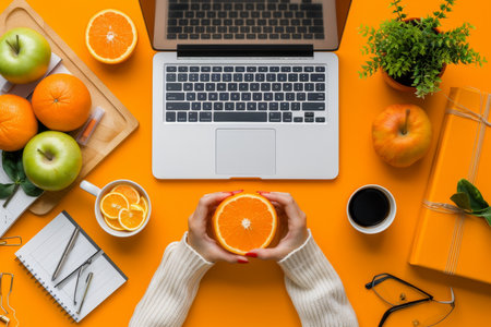 Woman Hands Holding Half Orange Over Table Top View, Desk With Laptop, Fruits, Coffee Break