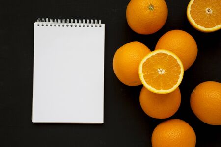 Ripe organic oranges, blank notepad on a black surface, top view. Flat lay, overhead, from above. Copy space.