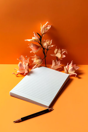 A serene workspace featuring a notebook open for creativity surrounded by fresh oranges and delicate flowers, offering a burst of color and inspiration.
