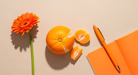 A vibrant flat lay on a beige background featuring a monochromatic orange color scheme. An orange gerbera daisy, a partially peeled orange, an orange notebook, and a matching pen are neatly arranged, creating a cheerful and creative composition.