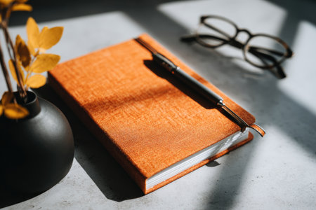 Orange leather-bound journal, a pen, a pair of eyeglasses, and a vase of autumn leaves are arranged on a light gray surface, casting interesting shadows. The image highlights the texture of the journal's cover and the overall aesthetic of the scene.