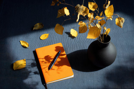 Arrangement of autumnal objects, including a vibrant orange notebook, a matte black vase holding dried, golden leaves and branches, and scattered autumn leaves on a dark-colored textured surface. The scene is illuminated by natural sunlight, casting soft shadows, creating a warm and inviting atmosphere.