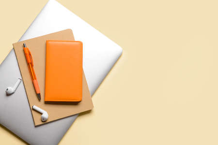 Top view of workspace with notebooks, stationery, coffee cup and copy space in home office room