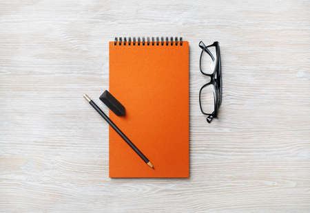 Orange notebook, glasses, pencil and eraser on light wooden background. Blank stationery template. Top view. Flat lay.