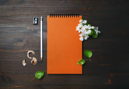 Orange notepad, pencil, sharpener and flowers on wooden background. Blank stationery set. Top view. Flat lay.