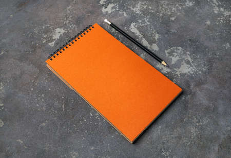 Blank orange notebook and pencil on concrete background. Template for branding design.