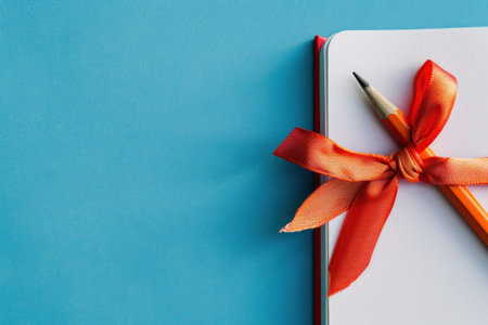 Travel journal with pencil and orange ribbon on blue background for business or personal use