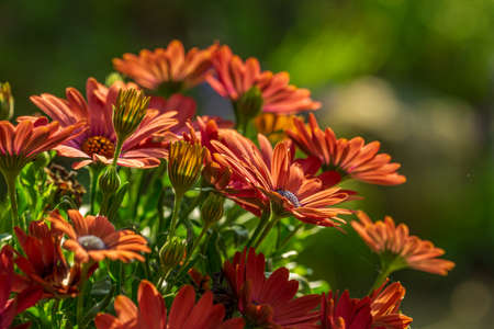 Beautiful orange flowers blooms in the garden. Autumn background. Concept of fall season. Close up. Soft focus.